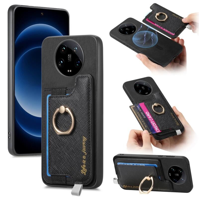 For Xiaomi 14 Ultra Retro Magsafe Cross Leather Ring Holder Card Bag Phone Case(Black)