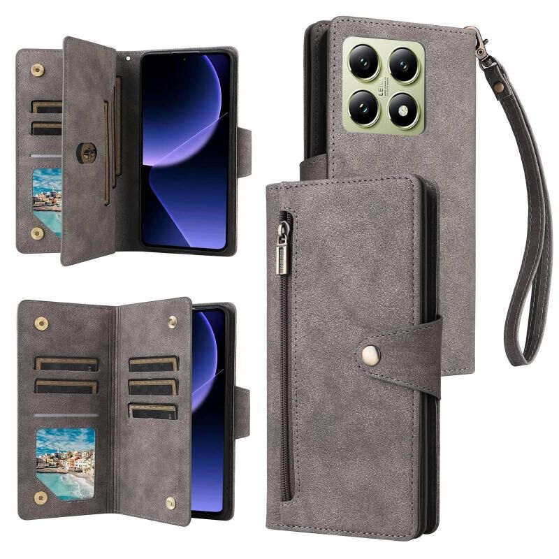 Θήκη τηλεφώνου δέρμα τριπλής πτυχής με αγκράφα καρφί για Xiaomi 14T 5G Global (Χρυσό Ρόδι), χωρητικότητα 9 καρτών.