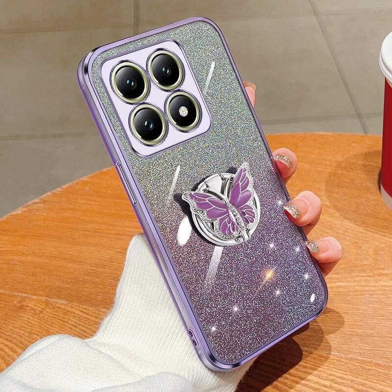 For Xiaomi 14T Plated Gradient Glitter Butterfly Holder TPU Phone Case(Purple)