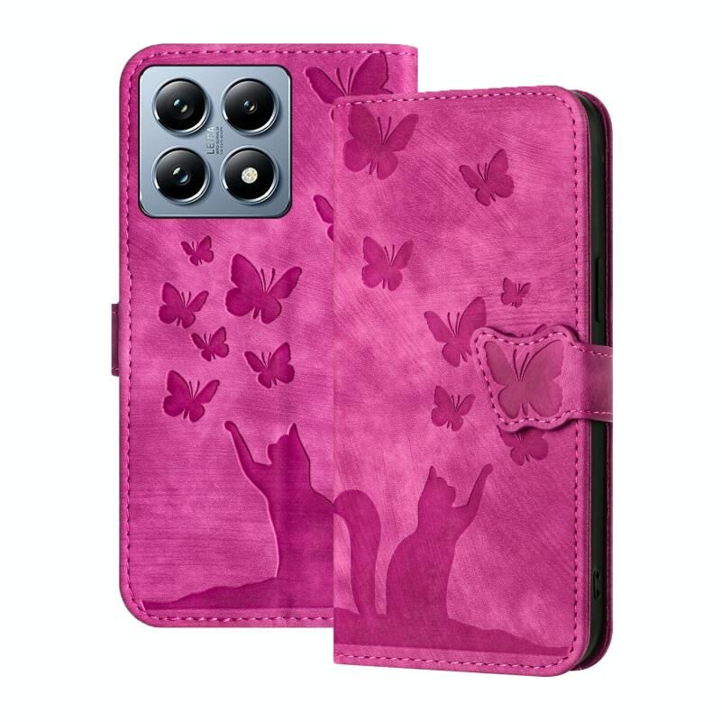 Θήκη τηλεφώνου από δέρμα με ανάγλυφο σχέδιο πεταλούδας γάτας για Xiaomi 14T Pro (Ροζ)