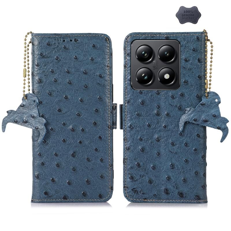 Θήκη τηλεφώνου από γνήσιο δέρμα με σχέδιο στρουθοκάμηλου για Xiaomi 14T Pro, με προστασία RFID (Μπλε)