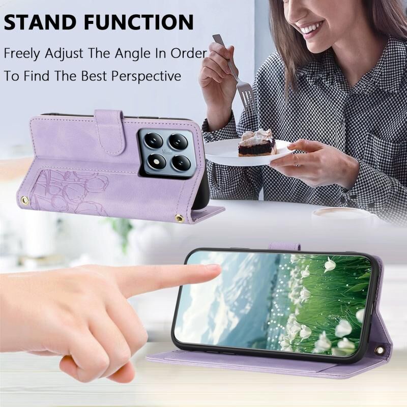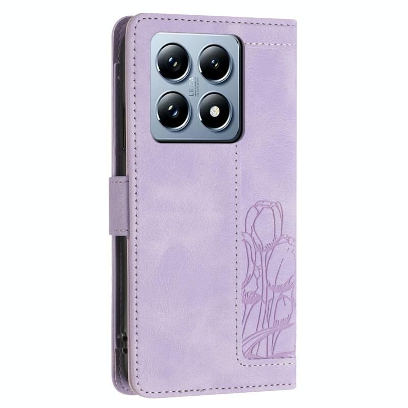 Θήκη τηλεφώνου από δέρμα με ανάγλυφα τουλίπες για Xiaomi 14T Pro με κορδόνι (Πράσινο)