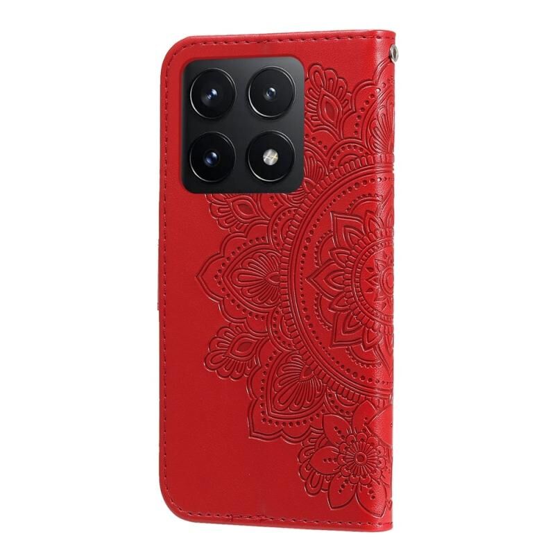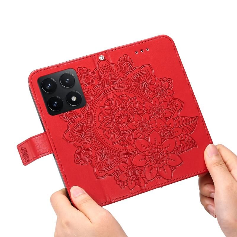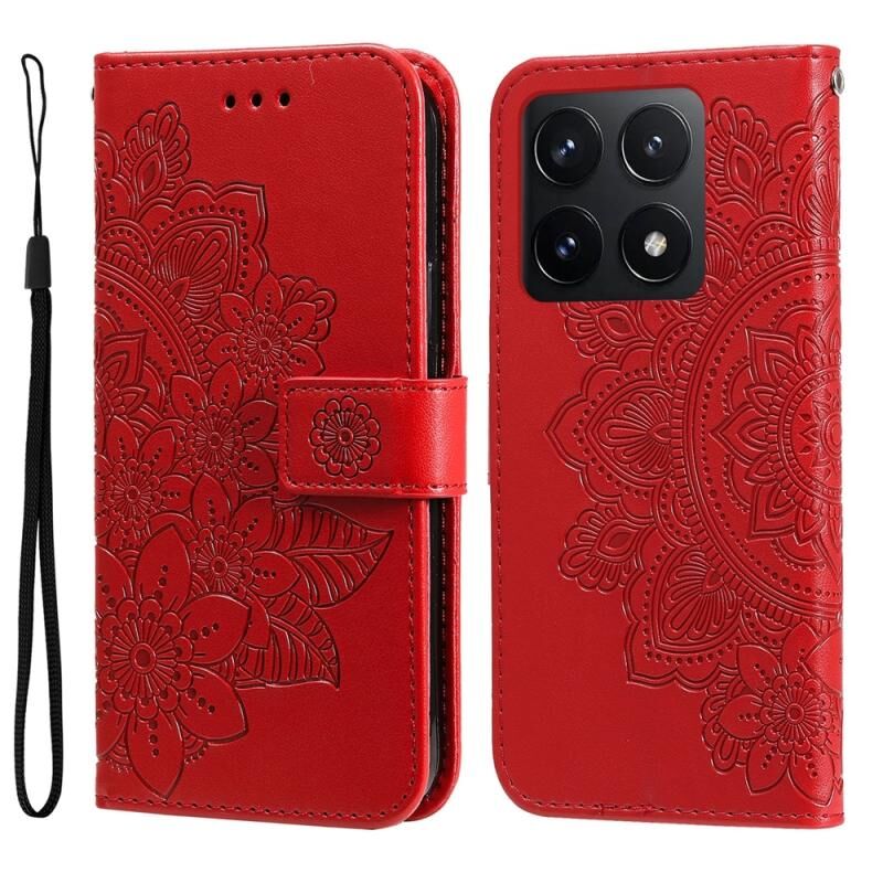 Για Xiaomi 14T Επτά-πέταλα λουλούδια ανάγλυφη δερμάτινη θήκη τηλεφώνου (κόκκινο)