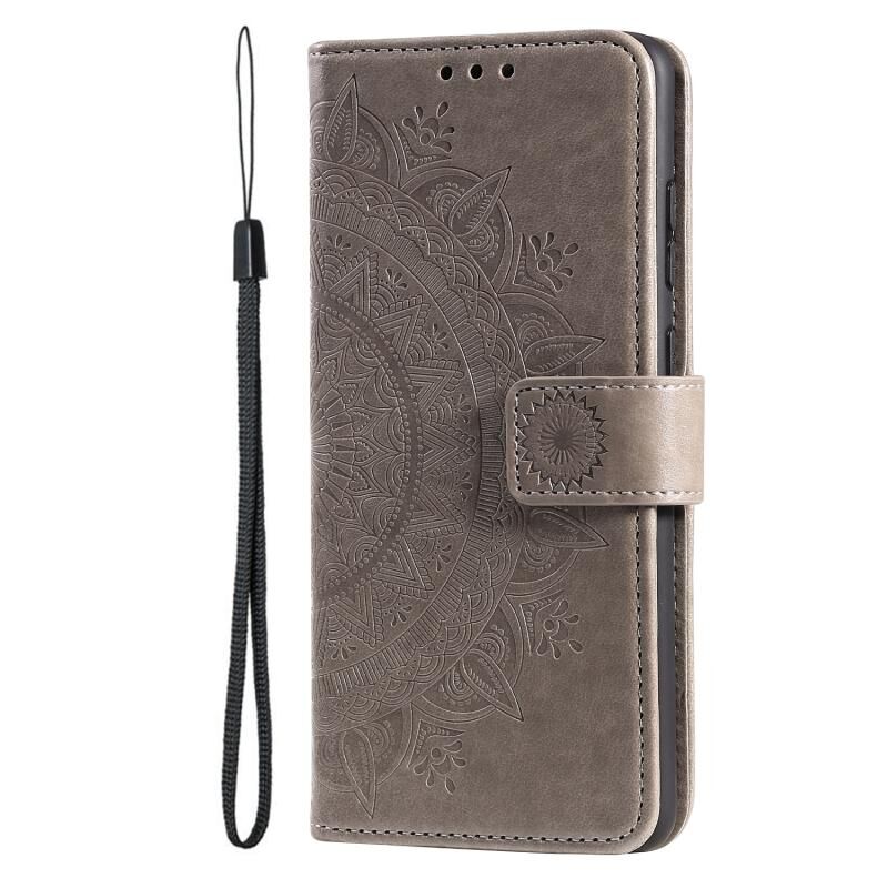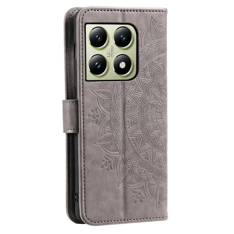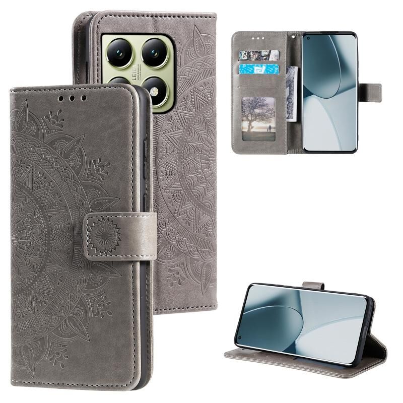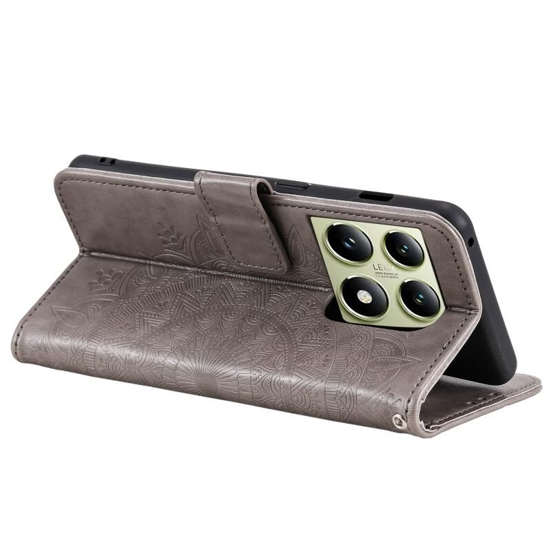 Για Xiaomi 14T Totem λουλούδι ανάγλυφο δερμάτινη θήκη τηλεφώνου με κορδόνι (γκρι)