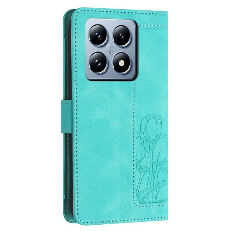 For Xiaomi 14T Tulips Embossed Leather Phone Case with Lanyard(Green)