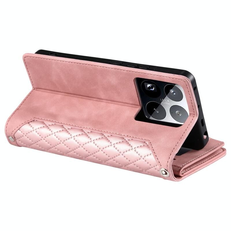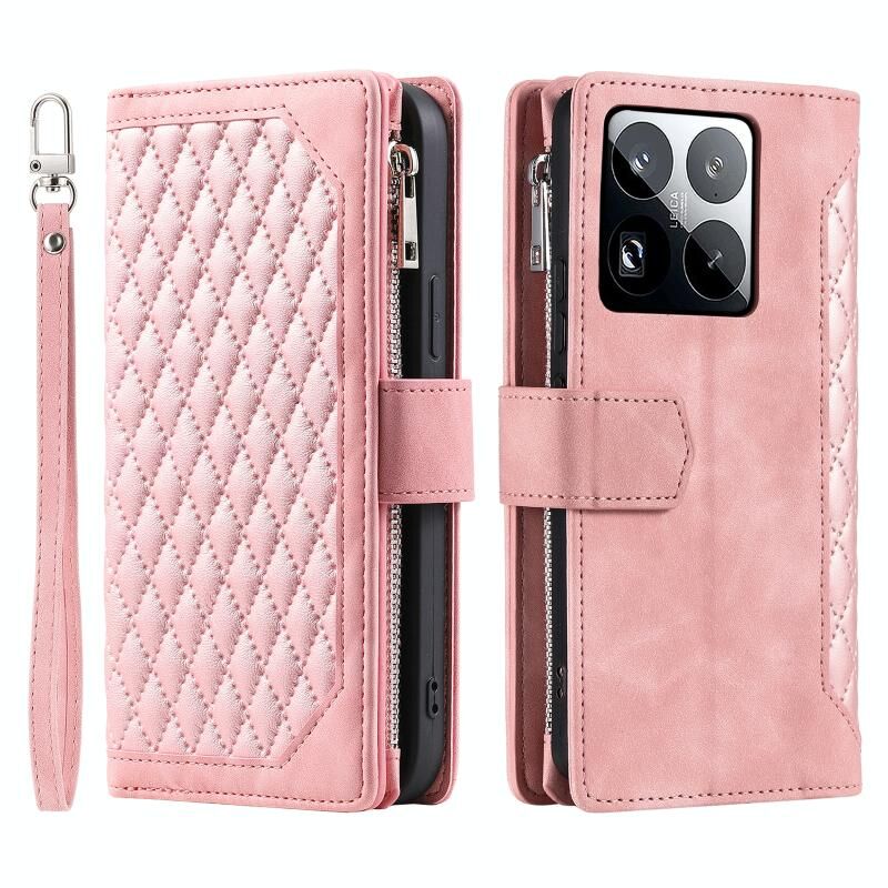 Για Xiaomi 15 Pro Πλέγμα υφή φερμουάρ δερμάτινη θήκη τηλεφώνου με κορδόνι (Rose Gold)