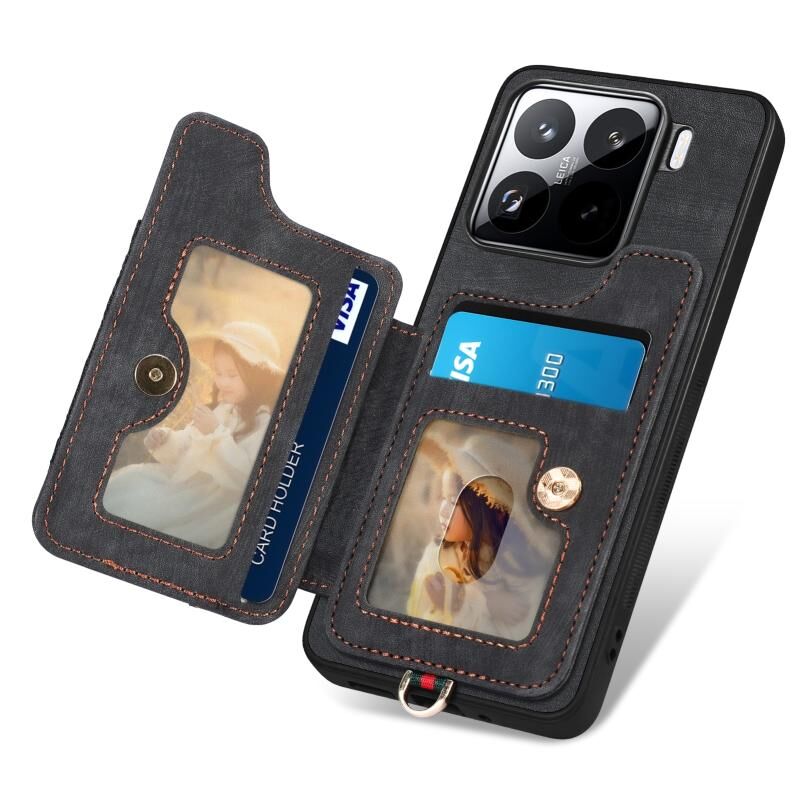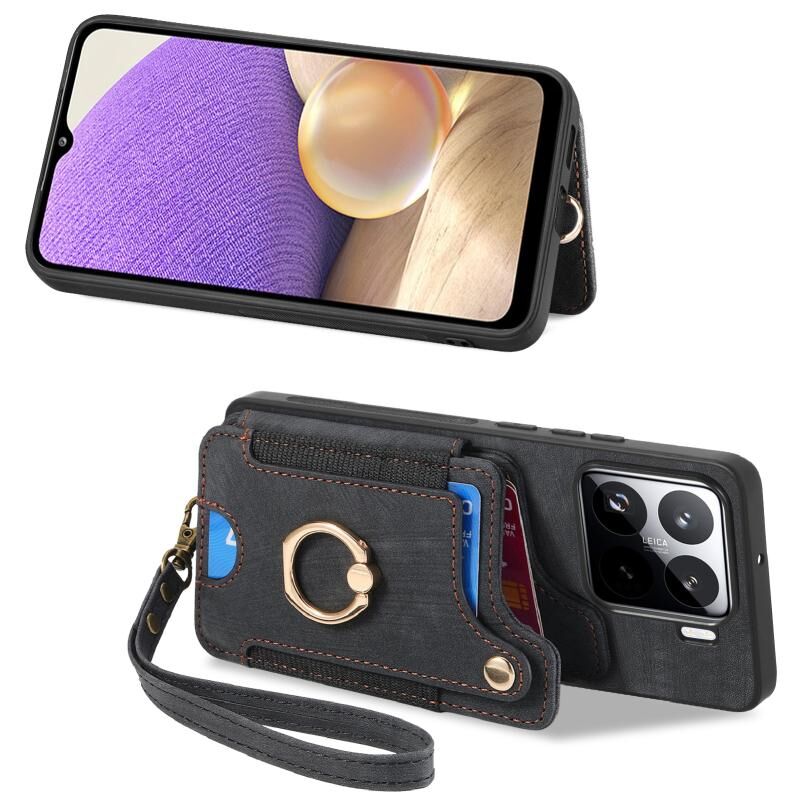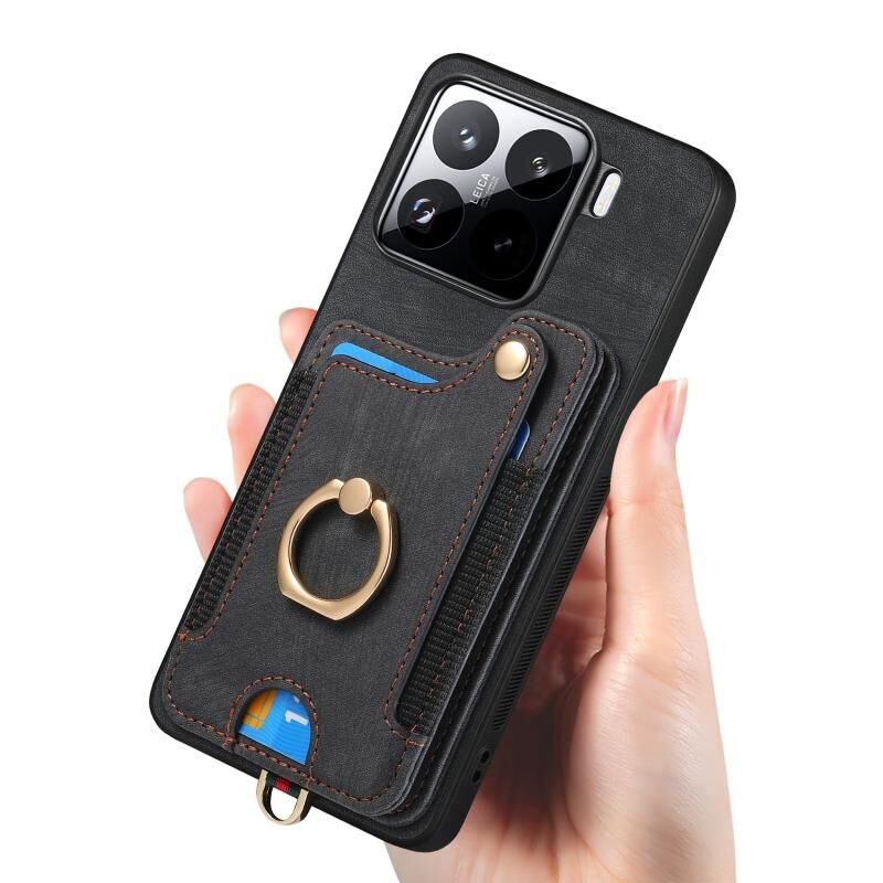 Για Xiaomi 15 Pro Ρετρό δέρμα αίσθηση δαχτυλίδι πολυ-κάρτα RFID πορτοφόλι υπόθεση τηλεφώνου (Μαύρο)