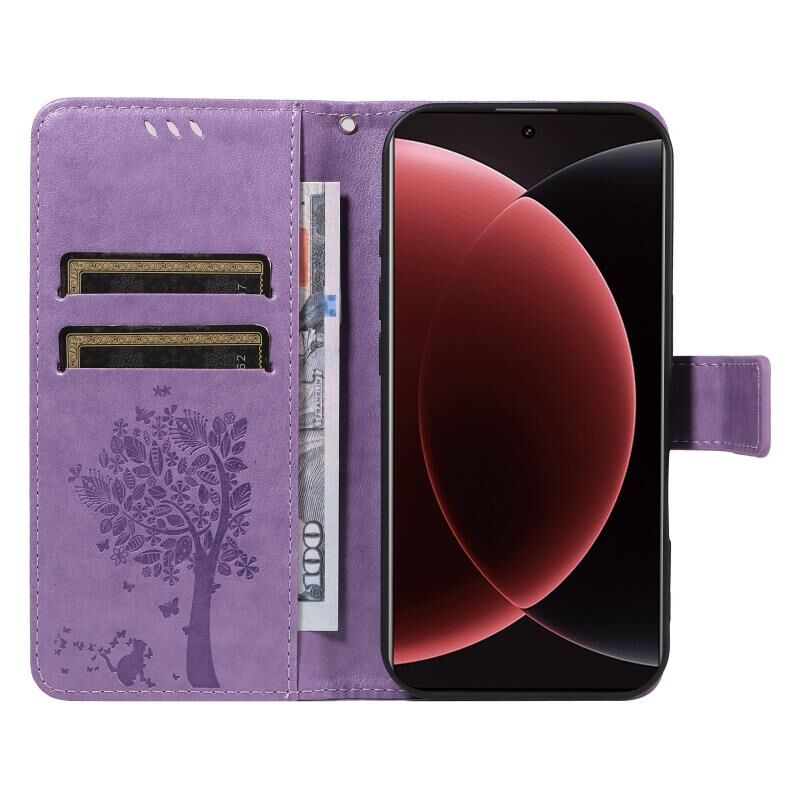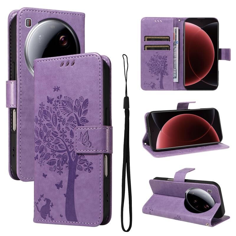 For Xiaomi 15 Ultra 5G Global Tree & Cat Embossed Pattern Flip Leather Phone Case(Purple)