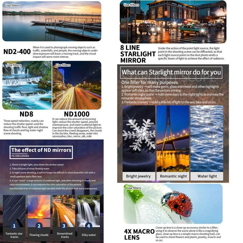 3. ND Filter: You can get more freedom to control aperture and shutter, bring more exposure methods and creative space for photography creation, and effectively prevent overexposure. The number behind ND represents the ability of the ND mirror to block light.