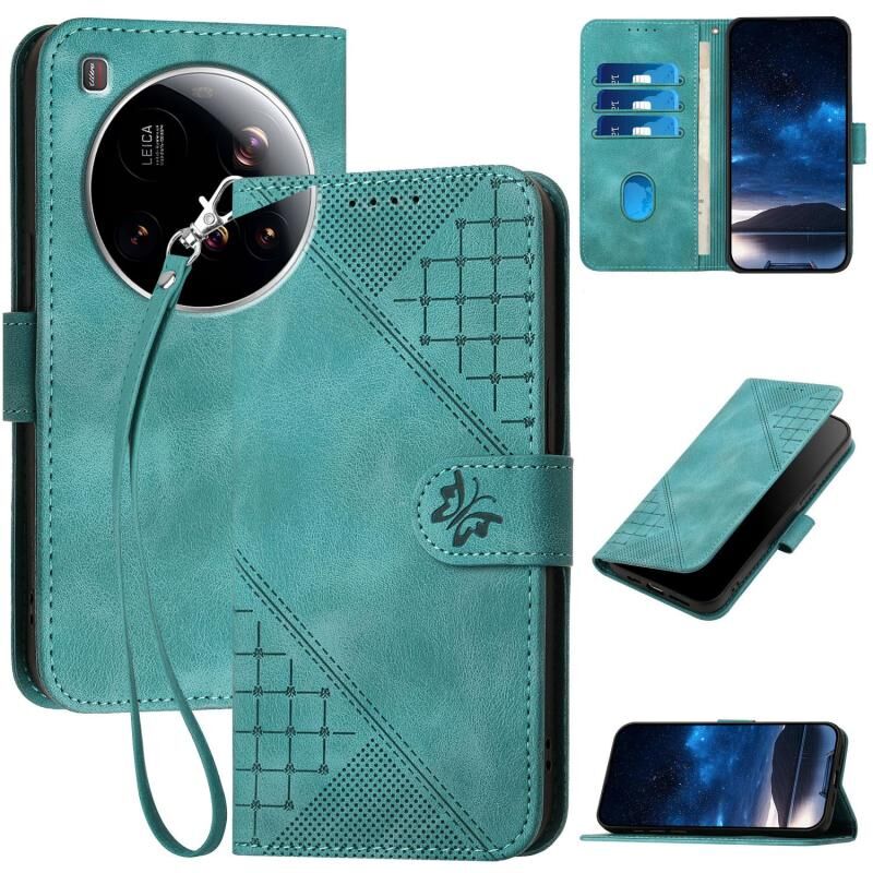 For Xiaomi 15 Ultra YX0080 Grid Butterfly Embossed Pattern Leather Phone Case with Lanyard(Light Blue)