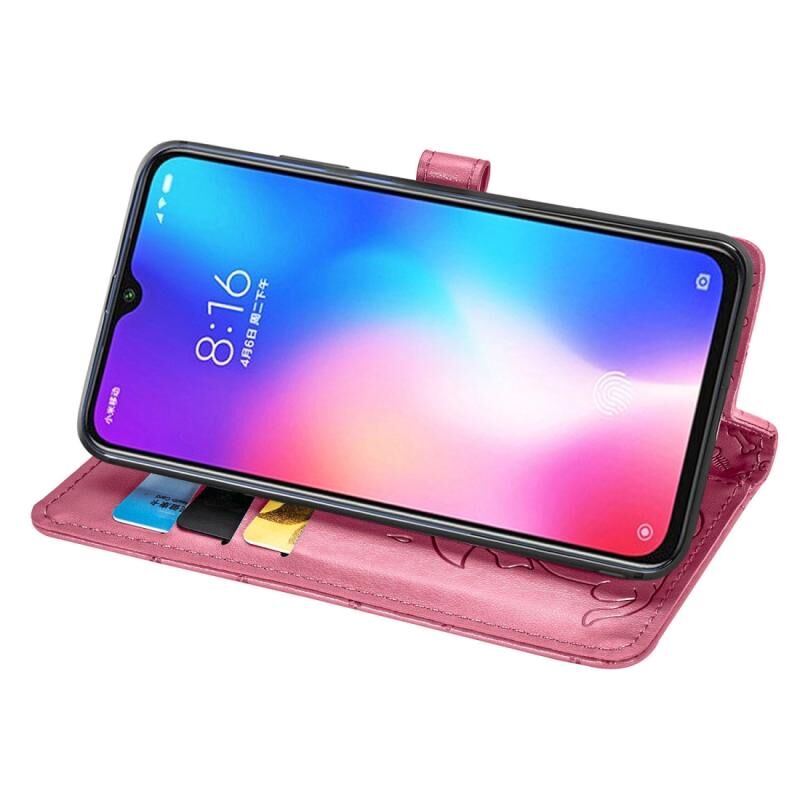 Θήκη δέρματος οριζόντιας αναδίπλωσης για Xiaomi 9 Se με χαριτωμένα ανάγλυφα σχέδια γάτας και σκύλου, με βάση / υποδοχή κάρτας / πορτοφόλι / κορδόνι (Ροζ)