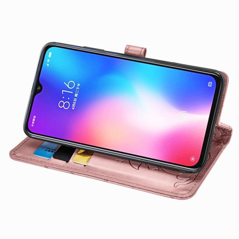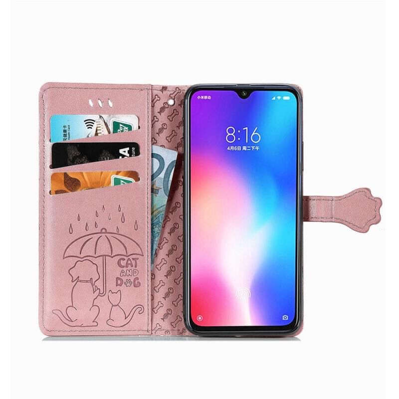 Θήκη δέρματος οριζόντιας αναδίπλωσης για Xiaomi 9 Se με χαριτωμένα ανάγλυφα σχέδια γάτας και σκύλου, με βάση / υποδοχή κάρτας / πορτοφόλι / κορδόνι (Ροζ)