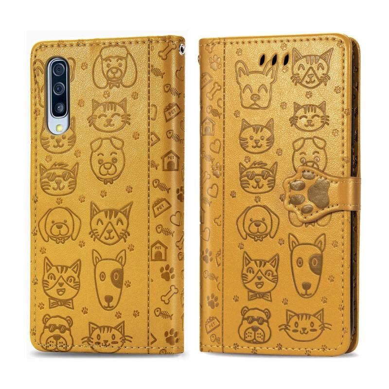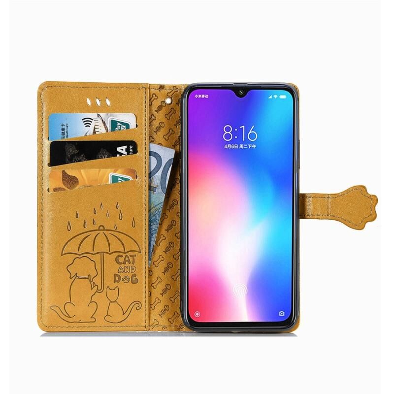 Θήκη δέρματος οριζόντιας αναδίπλωσης για Xiaomi 9 Se με χαριτωμένα σχέδια γάτας και σκύλου, με βάση στήριξης / υποδοχή κάρτας / πορτοφόλι / κορδόνι (Κίτρινο)