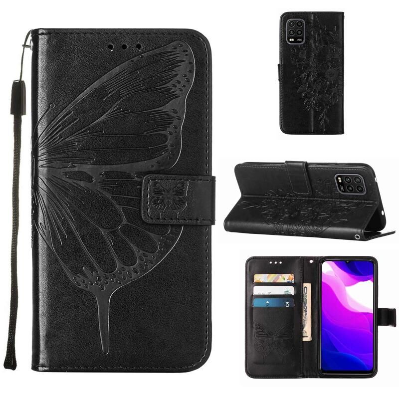 Για Xiaomi Mi 10 5G / 10 Pro 5G ανάγλυφη πεταλούδα δερμάτινη θήκη τηλεφώνου με θήκη & υποδοχή κάρτας & πορτοφόλι & κορδόνι (Μαύρο)