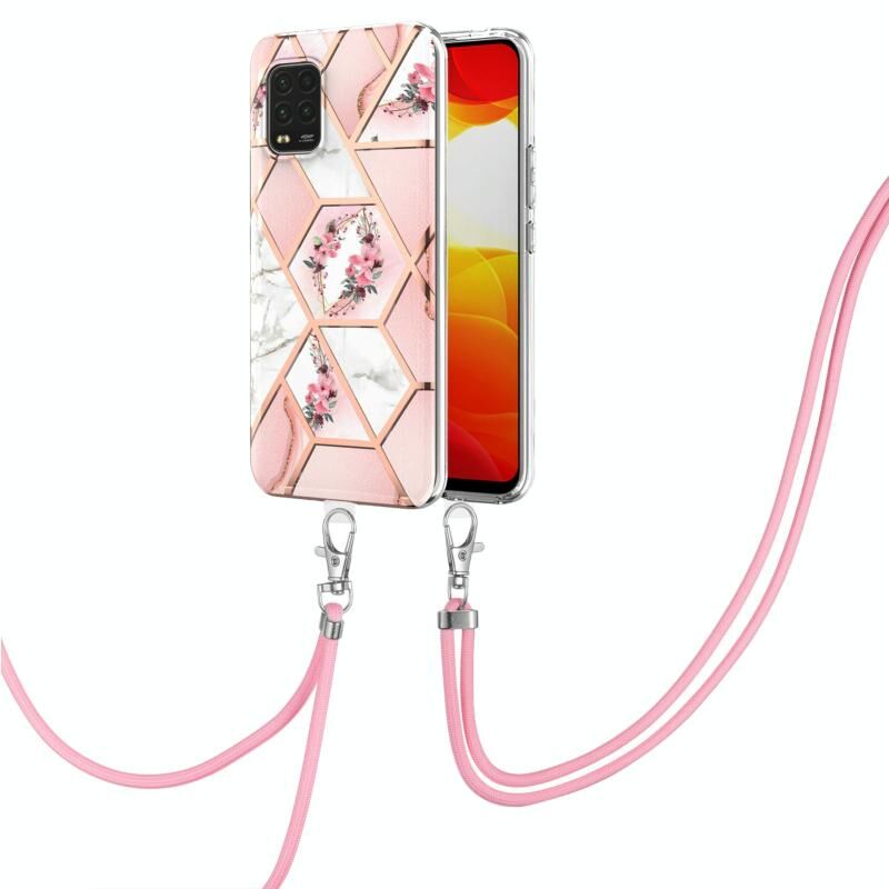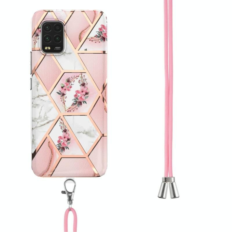 Θήκη προστασίας TPU με ενσωματωμένο κορδόνι για Xiaomi Mi 10 Lite 5G, με γαλβανισμό, συνδυασμό χρωμάτων και σχέδιο μαρμάρου με λουλούδια (Ροζ Λουλούδι).