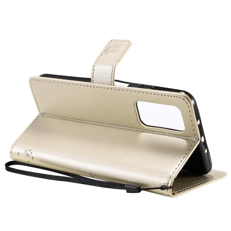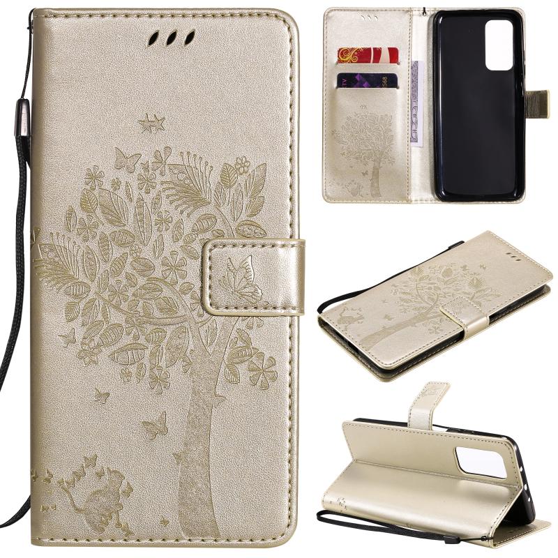 Για Xiaomi Mi 10T / 10T Pro Θήκη Δερμάτινη PU με Οριζόντιο Άνοιγμα, με σχέδιο Δέντρου & Γάτας, με εκτύπωση υπό πίεση, με βάση στήριξης & Θήκες Καρτών & Πορτοφόλι & Λουρί (Χρυσό)