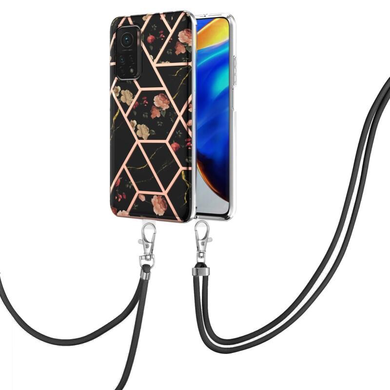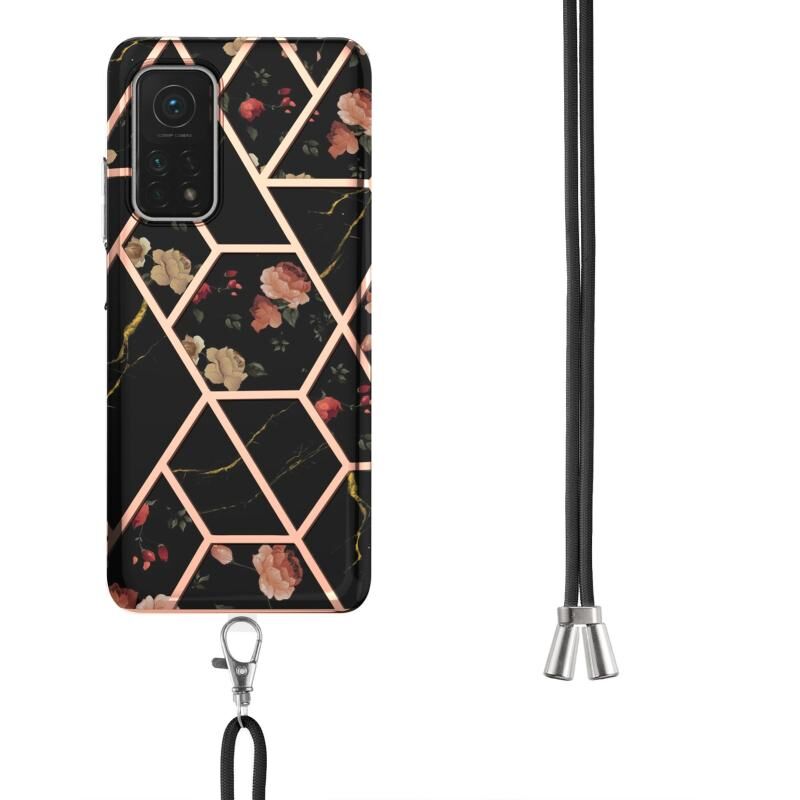 Για Xiaomi Mi 10T 5G / 10T Pro 5G Θήκη προστασίας από TPU με ηλεκτρολυτική επιμετάλλωση, συνδυασμό μαρμάρου και λουλουδιών, αντικραδασμική με κορδόνι (Ροζ Λουλούδι)