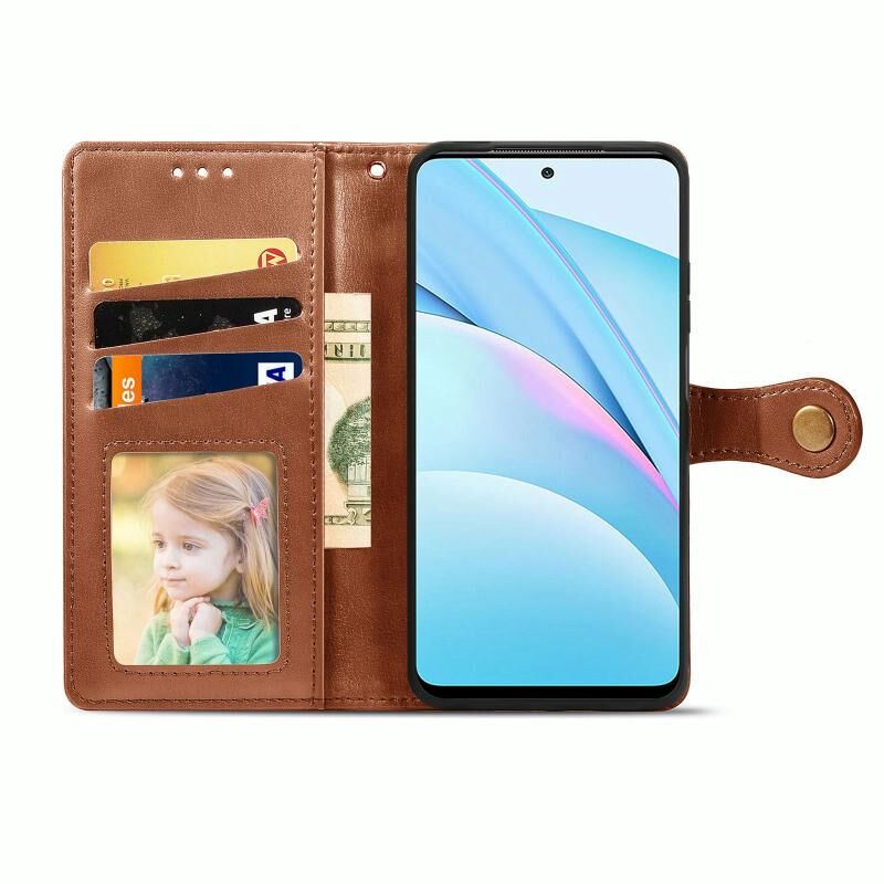 Για Xiaomi Mi 10T Lite 5G Ρετρό στερεό χρώμα δερμάτινη θήκη τηλεφώνου με αγκράφα & κορνίζα φωτογραφιών & υποδοχή κάρτας & πορτοφόλι & λειτουργία στάσης (καφέ)