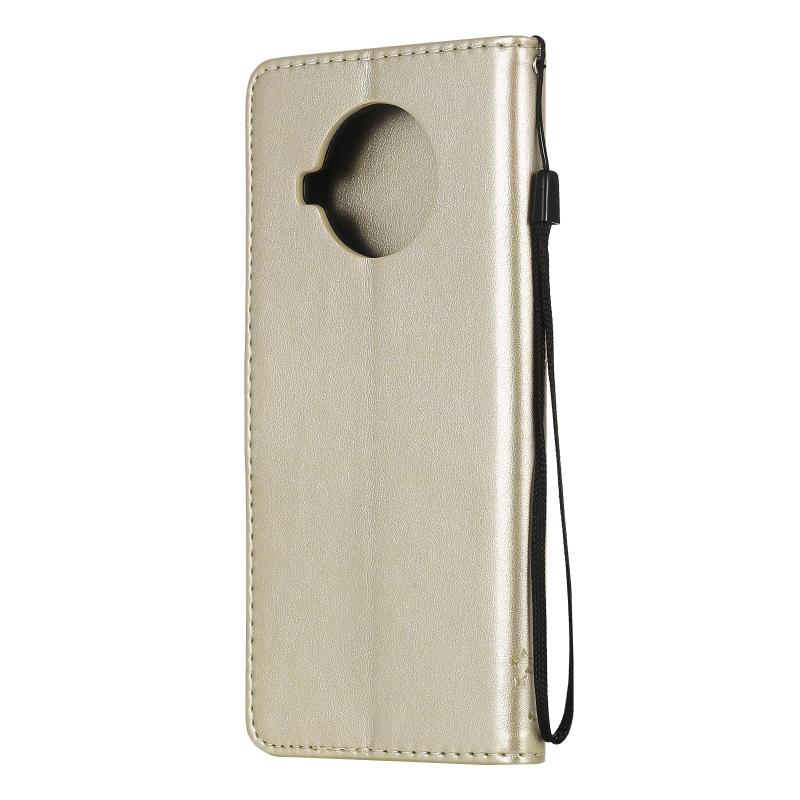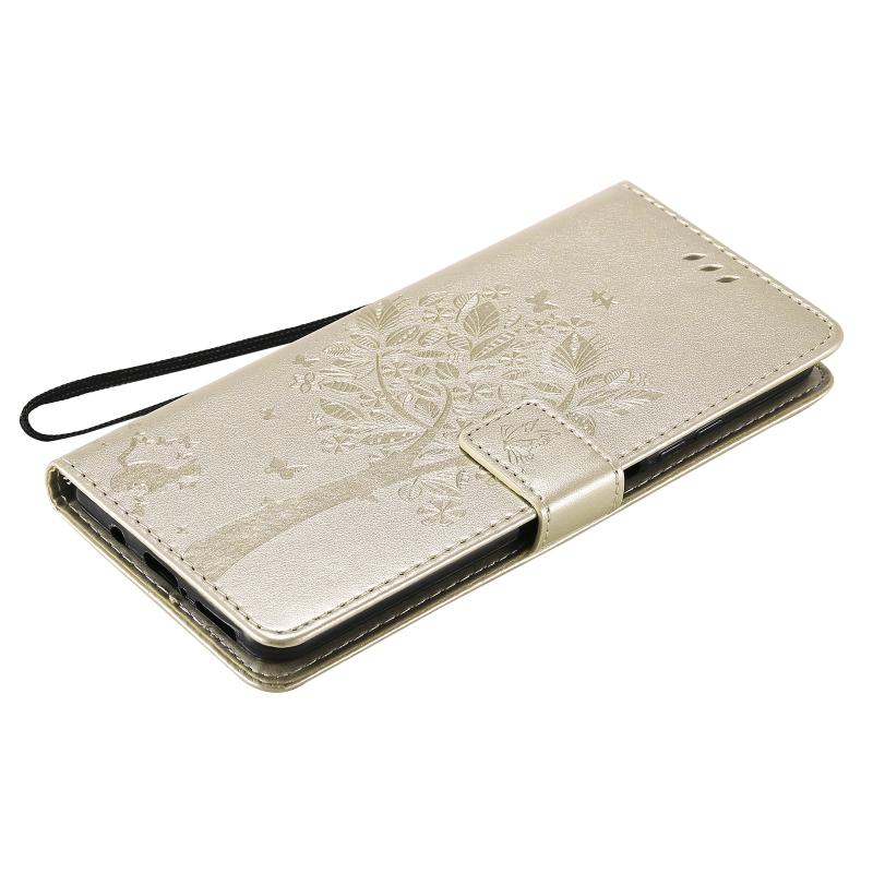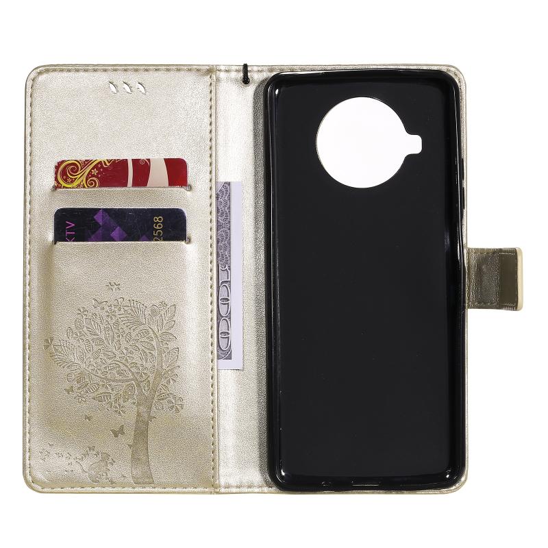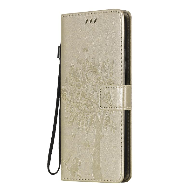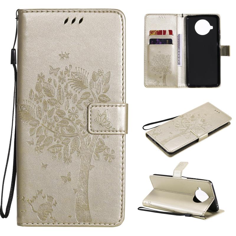 For Xiaomi Mi 10T Lite 5G Tree & Cat Pattern Pressed Printing Horizontal Flip PU Leather Case with Holder & Card Slots & Wallet & Lanyard(Gold)