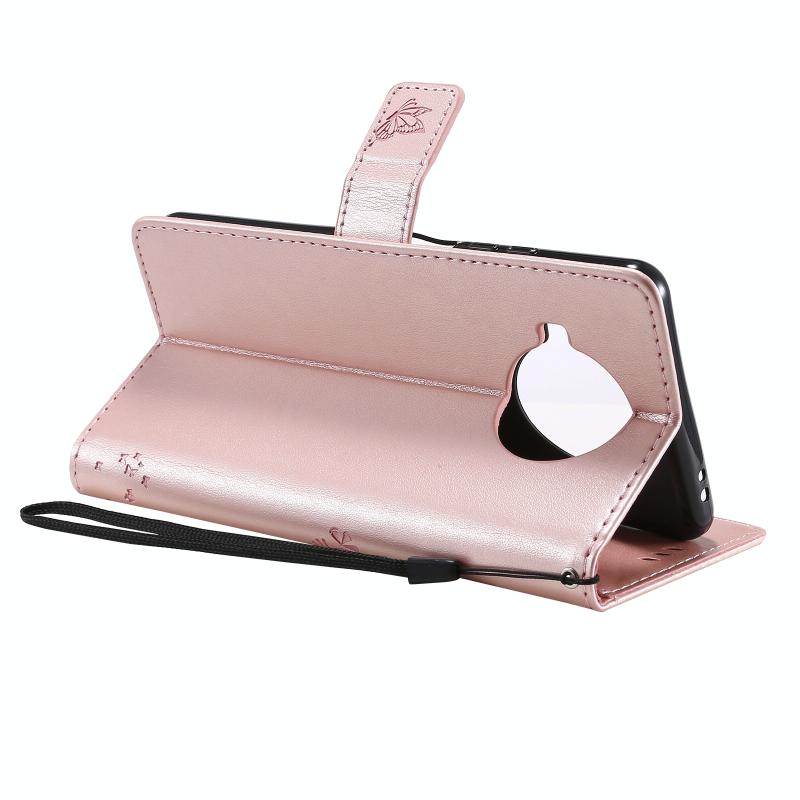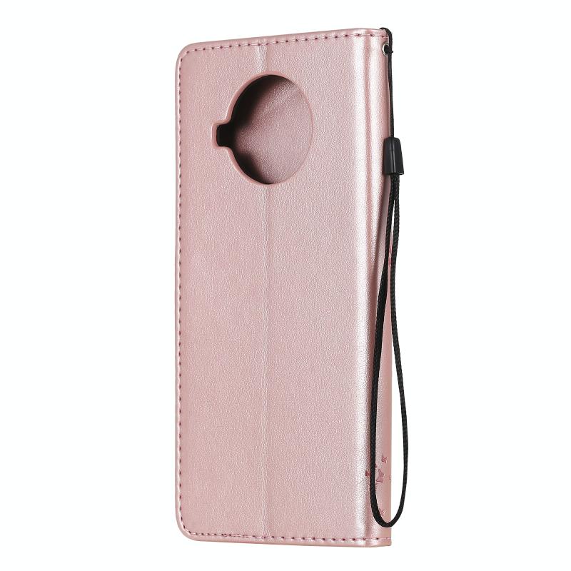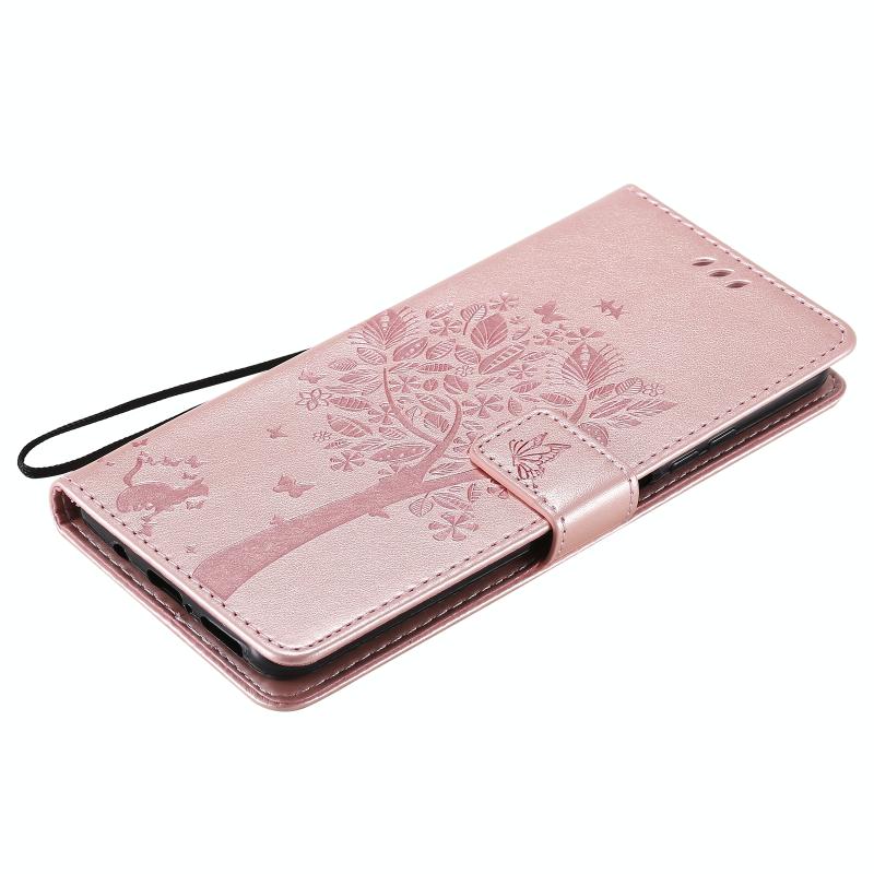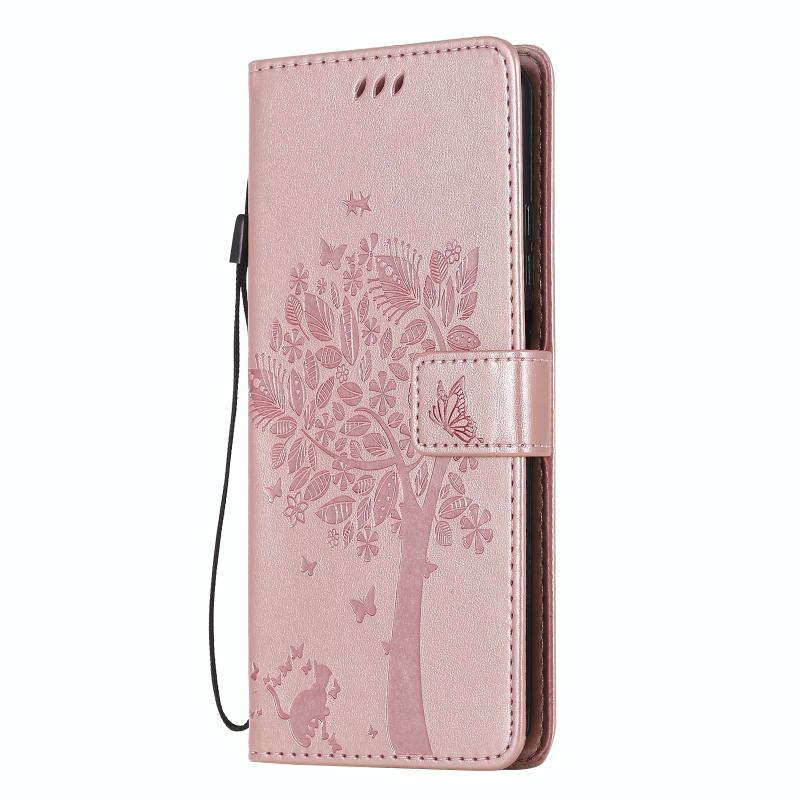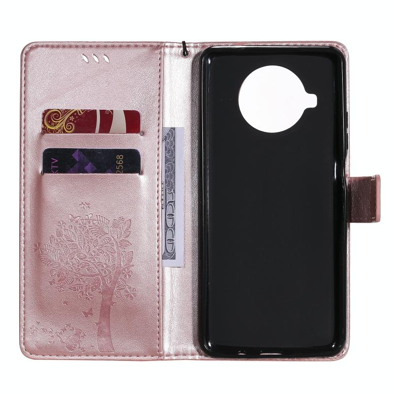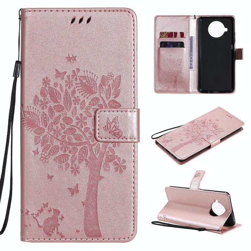 For Xiaomi Mi 10T Lite 5G Tree & Cat Pattern Pressed Printing Horizontal Flip PU Leather Case with Holder & Card Slots & Wallet & Lanyard(Rose Gold)