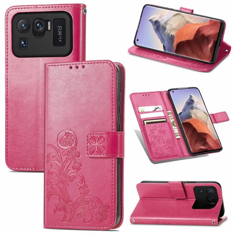 Για Xiaomi Mi 11 Ultra τετράφυλλο κούμπωμα ανάγλυφο αγκράφα κινητό τηλέφωνο προστασία δερμάτινη θήκη με κορδόνι & υποδοχή κάρτας & πορτοφόλι & λειτουργία βραχίονα (Rose Red)