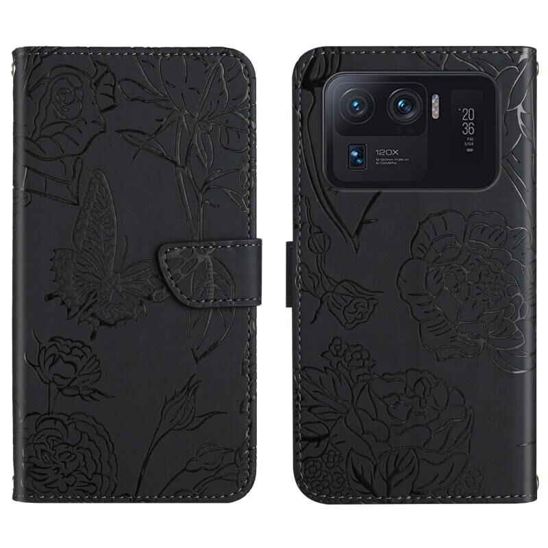 Θήκη τηλεφώνου Xiaomi Mi 11 Ultra με ανάγλυφο δέρμα πεταλούδας και παιώνιας, αίσθηση δέρματος (Μαύρο)