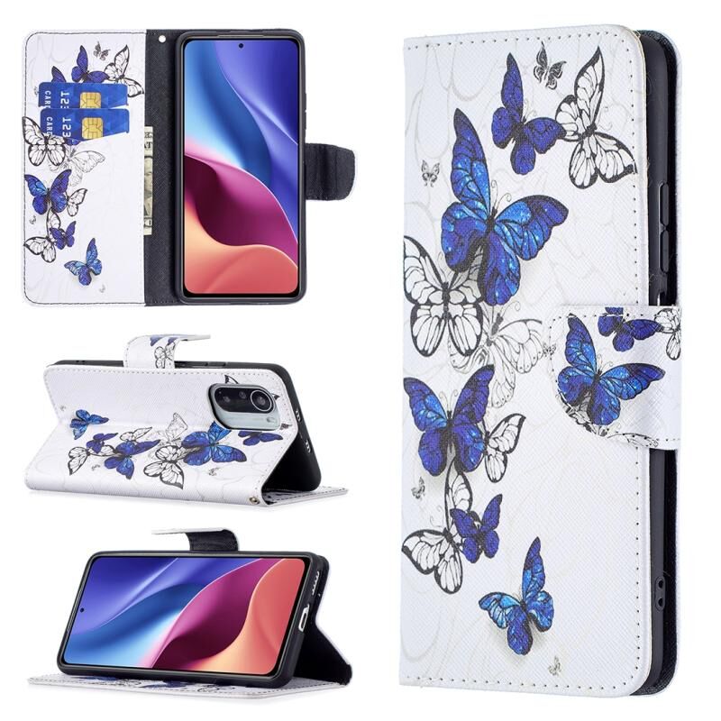 Θήκη δέρματος οριζόντιας αναδίπλωσης με σχέδια πολύχρωμης ζωγραφικής για Xiaomi Mi 11i / Poco F3 / Redmi K40 με βάση στήριξης & υποδοχές καρτών & πορτοφόλι (Μπλε πεταλούδες)