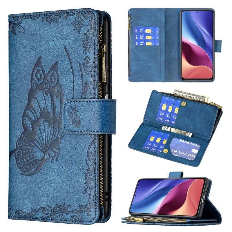 Για Xiaomi Mi 11i/Poco F3/Redmi K40 Flying Butterfly ανάγλυφο μοτίβο φερμουάρ οριζόντια Flip δερμάτινη θήκη με κάτοχο & υποδοχές καρτών & πορτοφόλι (μπλε)