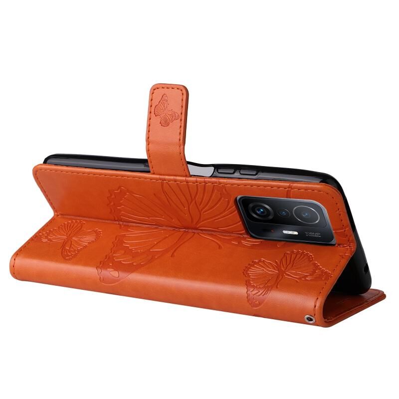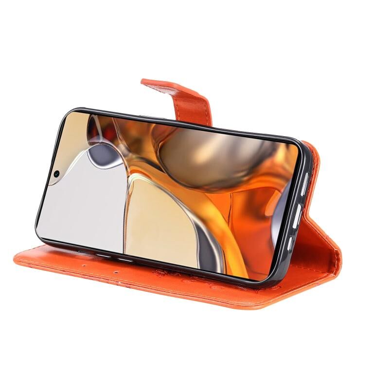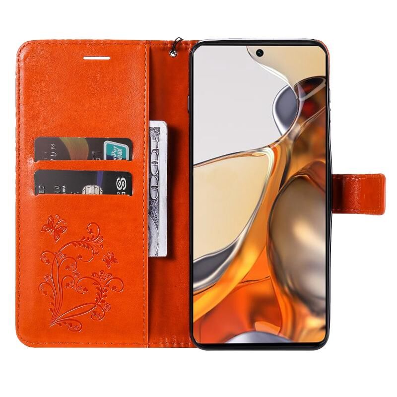 Για Xiaomi Mi 11T / 11T Pro Πιεσμένη εκτύπωση πεταλούδα μοτίβο οριζόντια Flip PU δέρμα υπόθεση με θήκη & υποδοχές καρτών & πορτοφόλι & κορδόνι (πορτοκαλί)