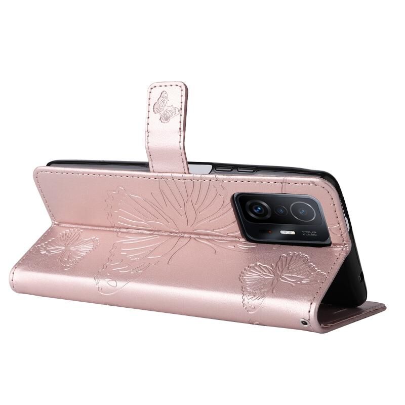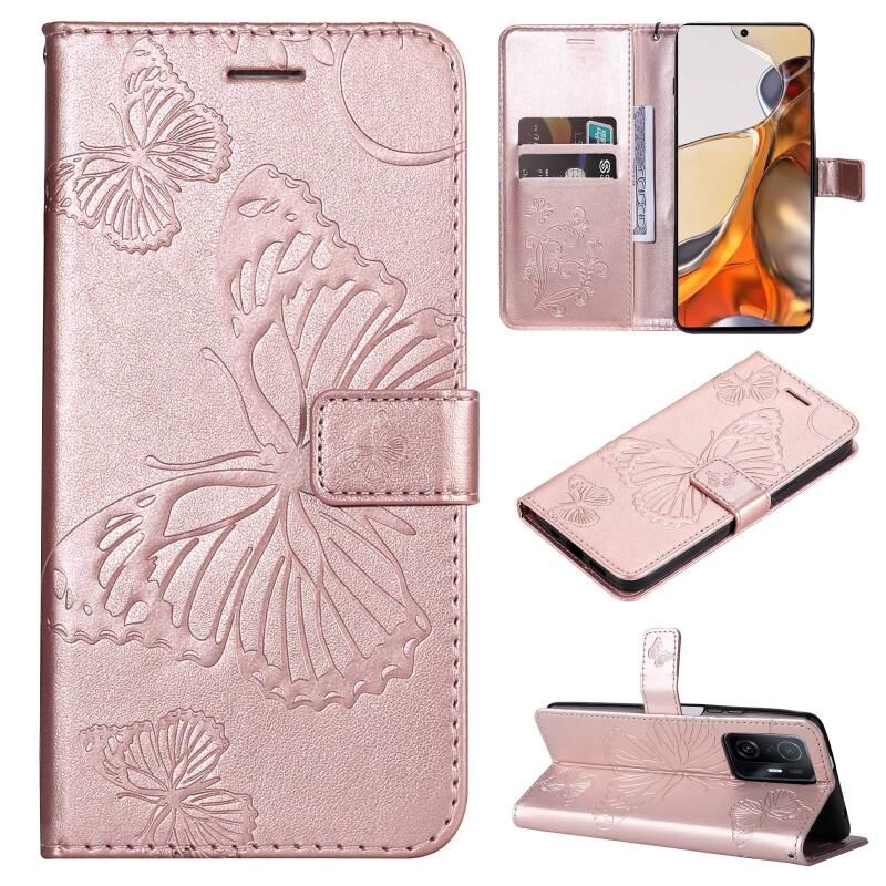 Για Xiaomi Mi 11T / 11T Pro Πιεσμένη εκτύπωση πεταλούδα μοτίβο οριζόντια Flip PU δέρμα υπόθεση με κάτοχο & υποδοχές καρτών & πορτοφόλι & Lanyard (Rose Gold)