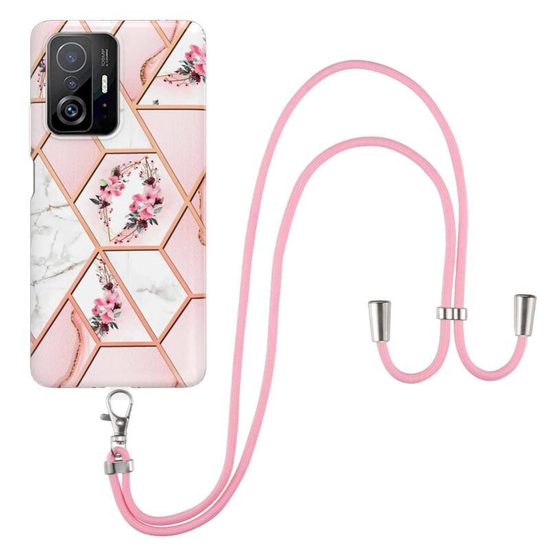 Θήκη τηλεφώνου TPU με κορδόνι για Xiaomi Mi 11T / Mi 11T Pro, με ηλεκτρολυτική επιμετάλλωση, συνδυασμό μαρμάρου και λουλουδιών (Ροζ Λουλούδι)