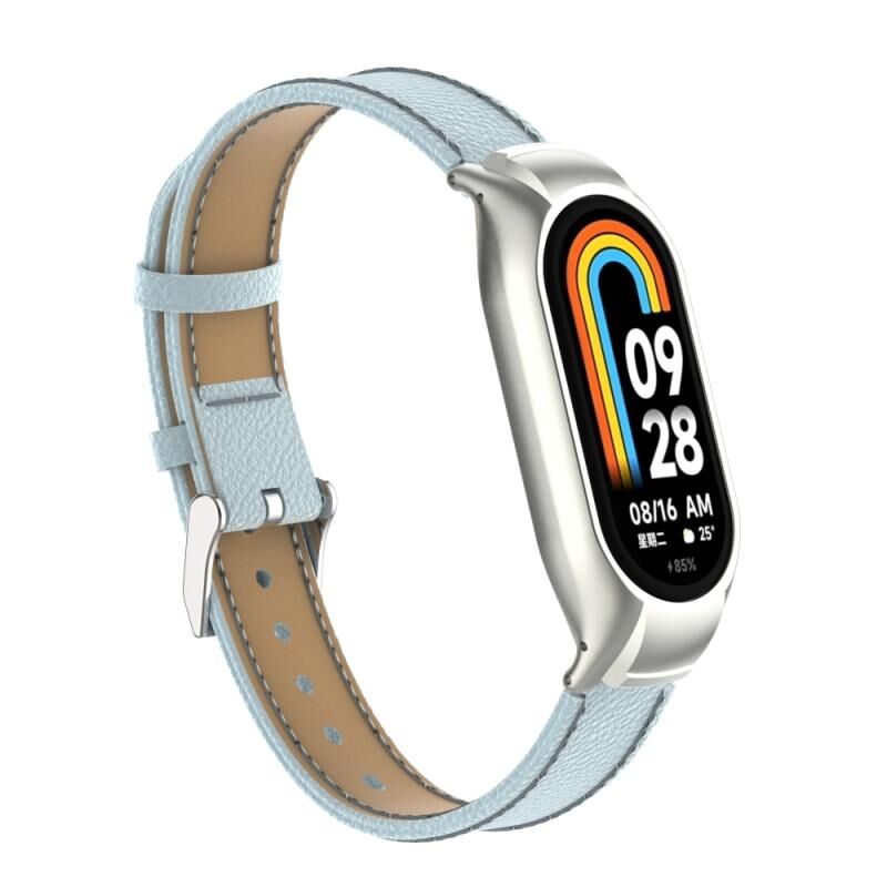 Για Xiaomi Mi Band 8 Ενσωματωμένη μεταλλική θήκη + δερμάτινη ζώνη ρολογιού με υφή Litchi (ανοιχτό κυανό)