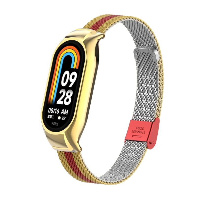 Για Xiaomi Mi Band 8 Ενσωματωμένη μεταλλική θήκη + ατσάλινη ζώνη ρολογιού με αγκράφα (χρυσό+κόκκινο)