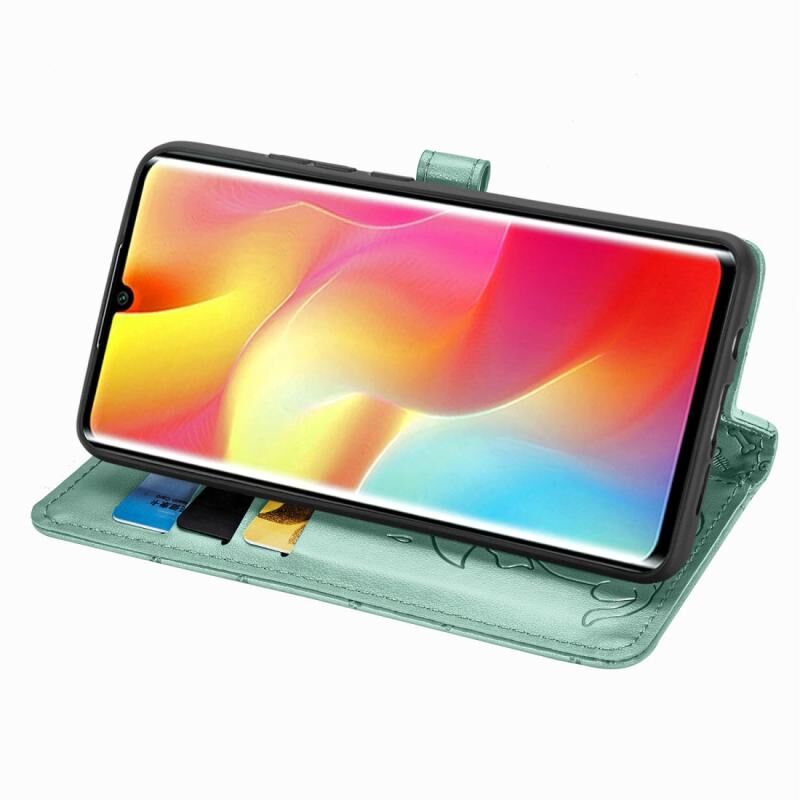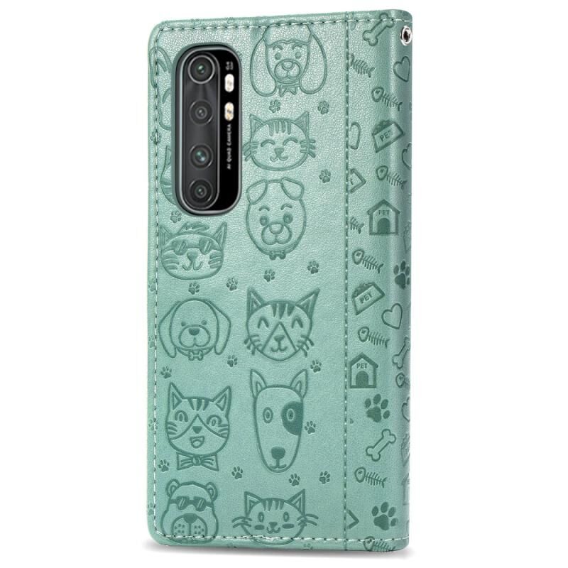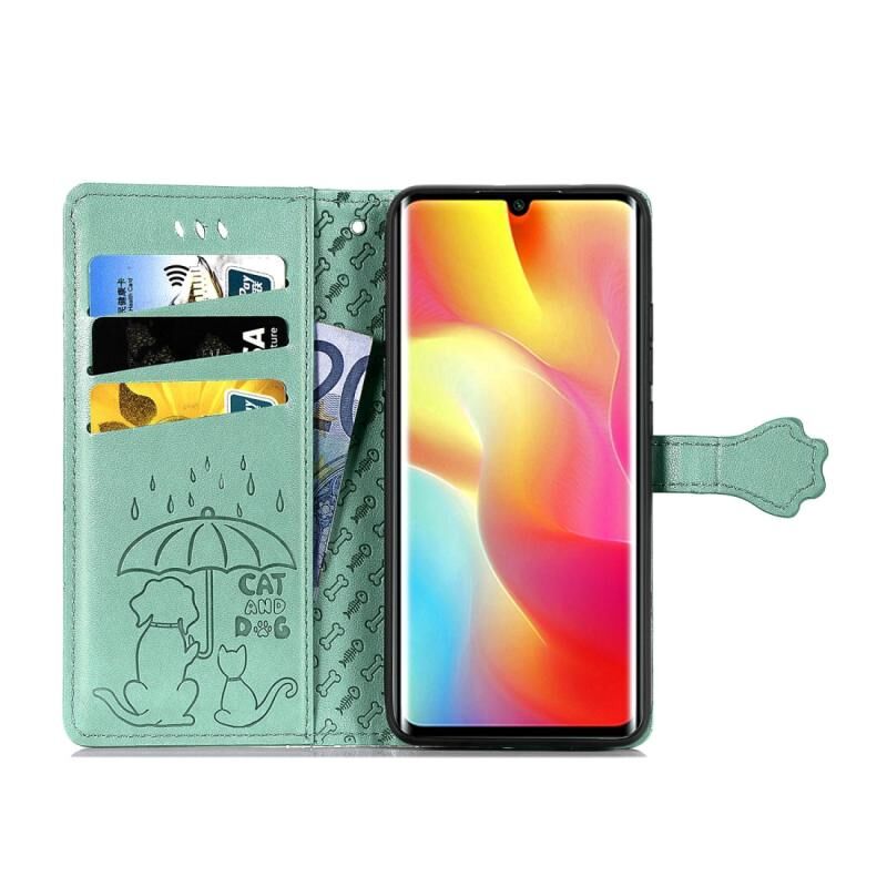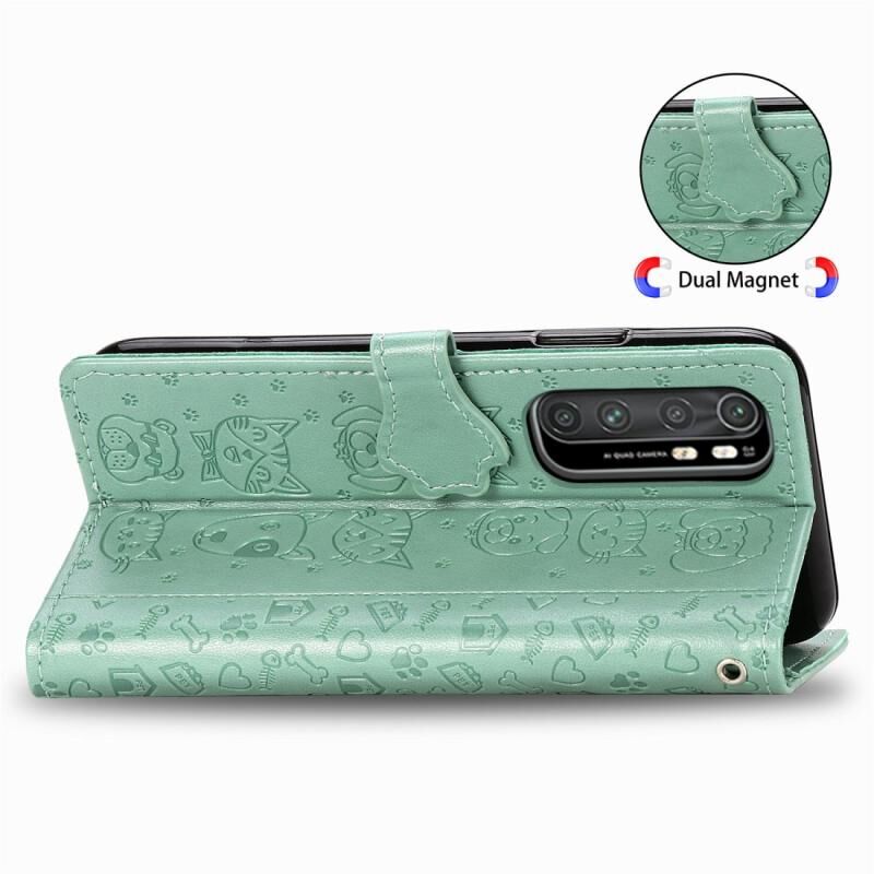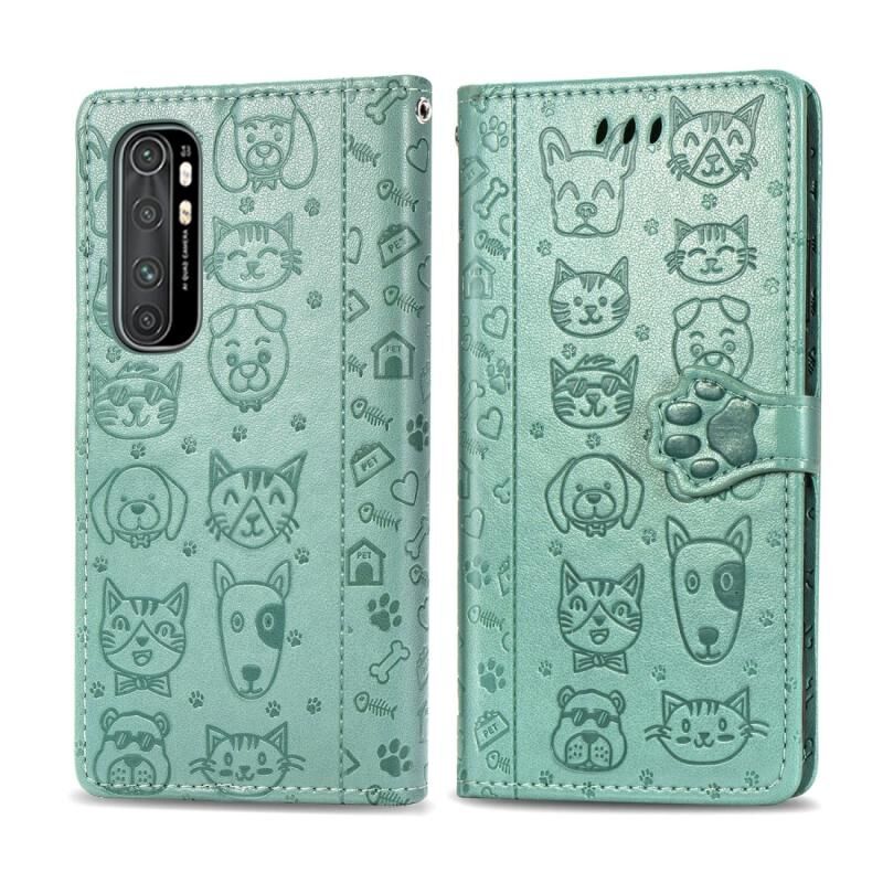 Θήκη δέρματος οριζόντιας αναδίπλωσης για Xiaomi Mi Note 10 Lite με χαριτωμένο σχέδιο ανάγλυφου γάτας και σκύλου, με βάση στήριξης & υποδοχές καρτών & πορτοφόλι & κούμπωμα καρτούν & κορδόνι (Πράσινο)