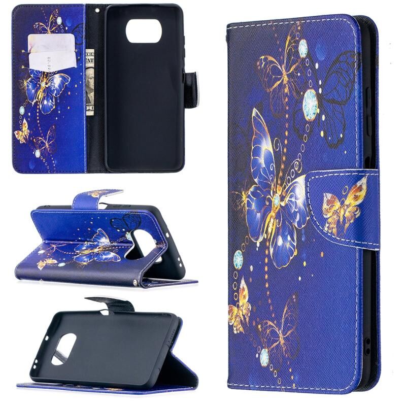 Θήκη δέρματος οριζόντιας αναδίπλωσης με σχέδια ζωγραφικής και χρώματα για Xiaomi Mi Poco X3 με βάση στήριξης & υποδοχές καρτών & πορτοφόλι (Μπλε Πεταλούδα)