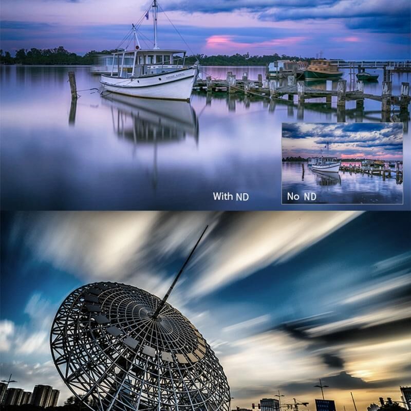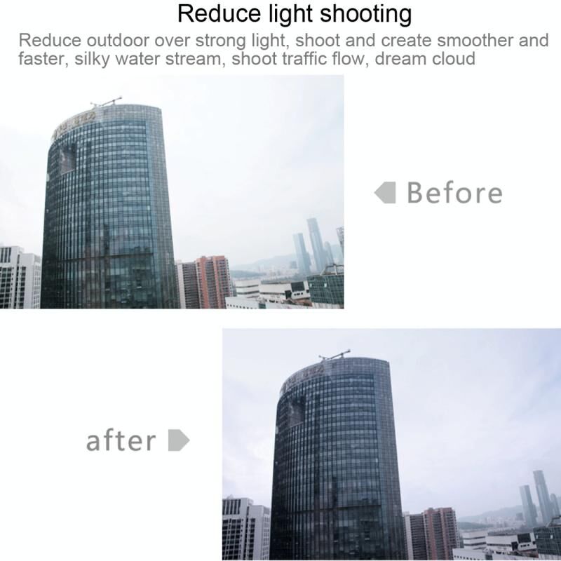 5. ND filter: Reduce miscellaneous light, present more realistic image effect. Great for portraiture and outdoor scenes in strong sunlight. Applies slow shutter speed under strong sunlight exposure. Allows wider apertures, effectively decreasing depth of field.