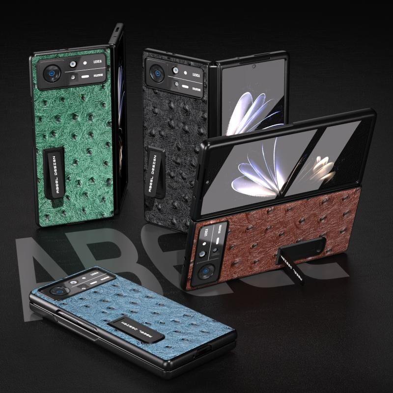 Θήκη τηλεφώνου από γνήσιο δέρμα στρουθοκάμπου με υφή για Xiaomi Mix Fold 2 με βάση στήριξης (Μπλε)