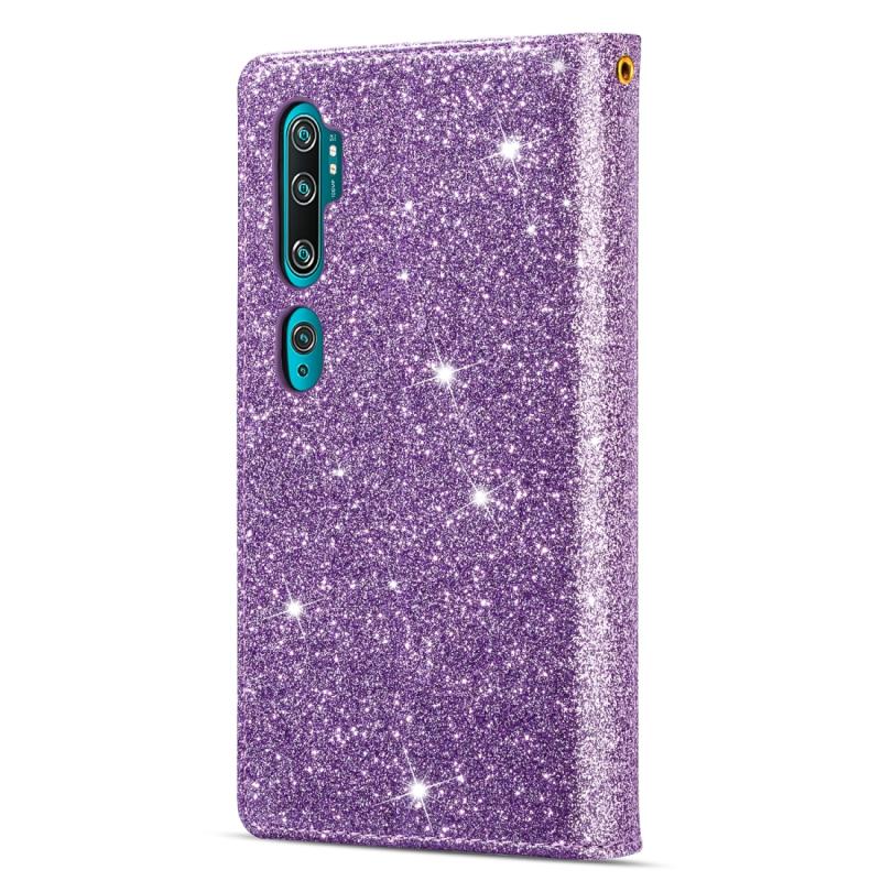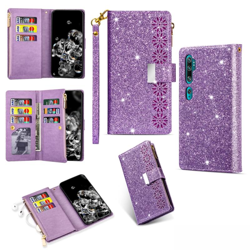 For Xiaomi Note 10 Pro Multi-card Slots Starry Sky Laser Carving Glitter Zipper Horizontal Flip Leather Case with Holder & Wallet & Lanyard(Purple)