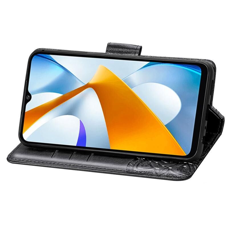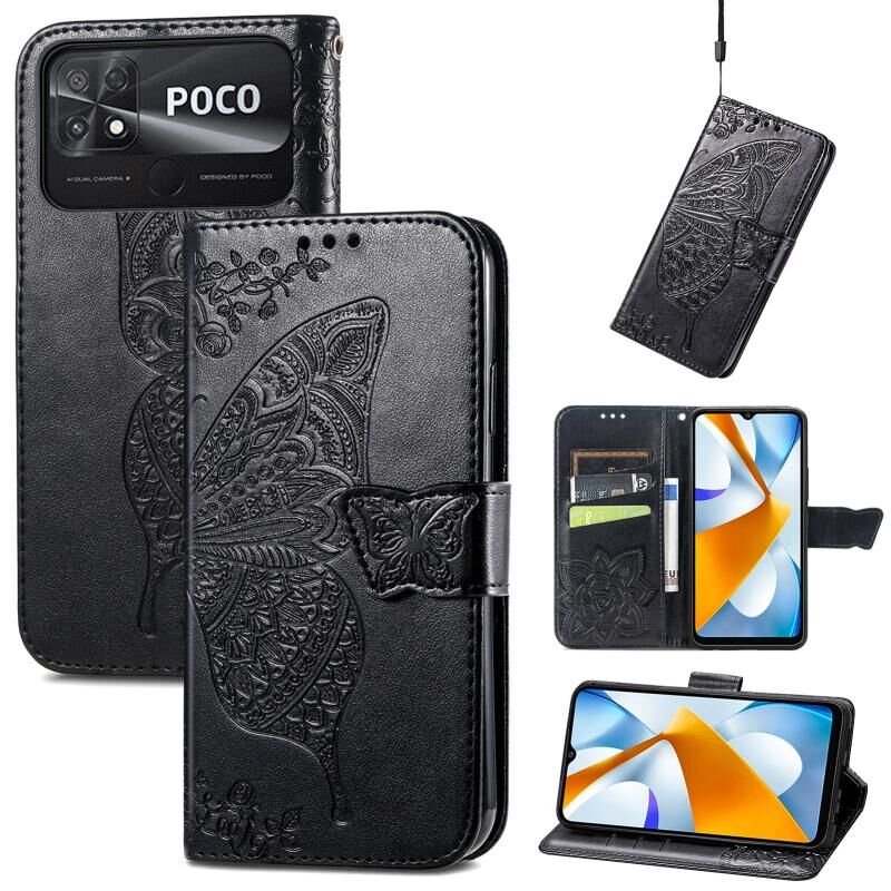 Θήκη τηλεφώνου από δέρμα με ανάγλυφο σχέδιο πεταλούδας και λουλουδιών για Xiaomi Poco C40 (Μαύρο)