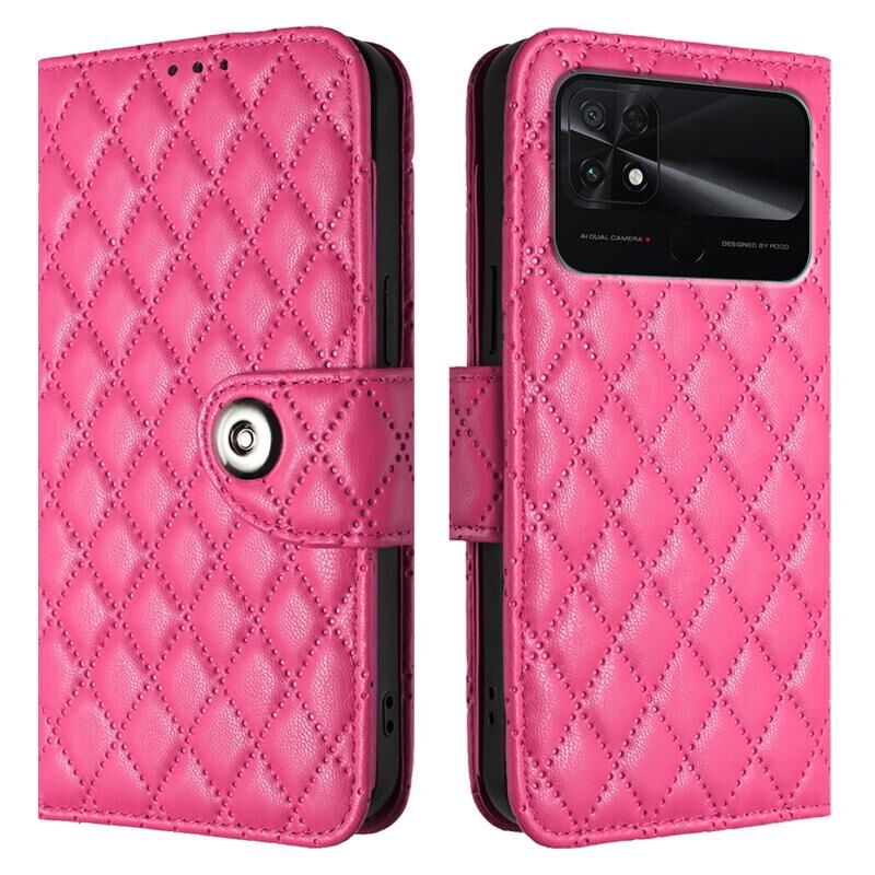 Για το Xiaomi Poco C40 Rhombic Texture Flip δερμάτινη θήκη τηλεφώνου με κορδόνι (Rose Red)
