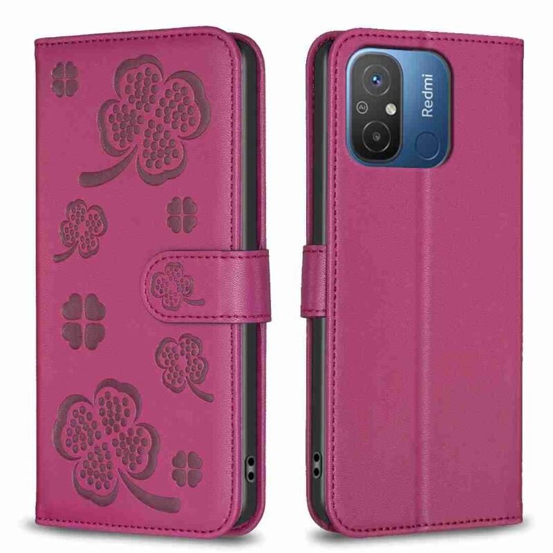 Για Xiaomi Poco C55 / Redmi 12C τεσσάρων φύλλων ανάγλυφη δερμάτινη θήκη τηλεφώνου (Rose Red)