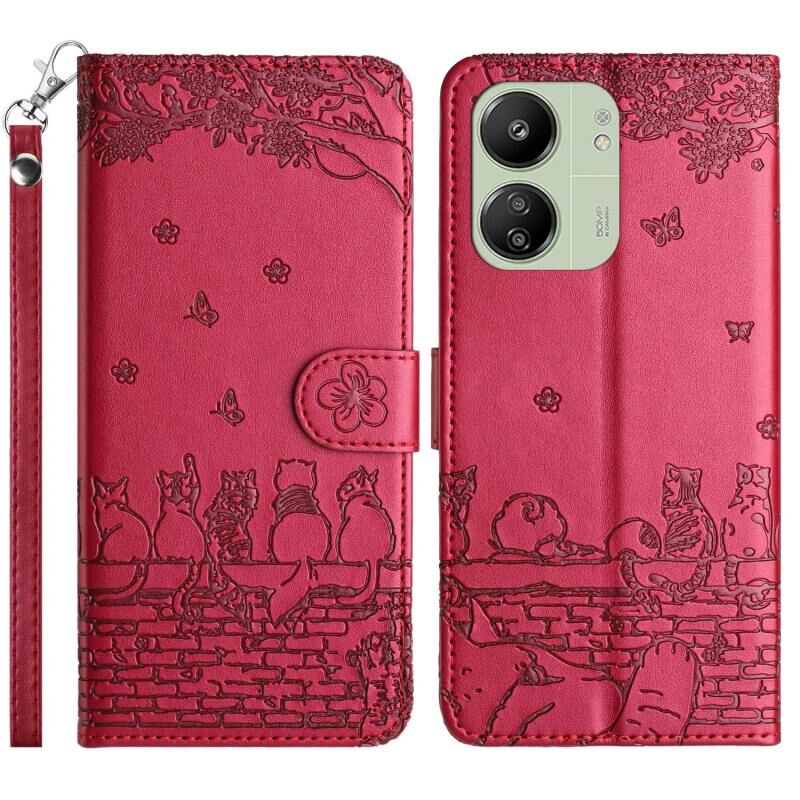 Θήκη τηλεφώνου από δέρμα με ανάγλυφο σχέδιο γάτας για Xiaomi Poco C65/Poco M6 με κορδόνι (Κόκκινο)