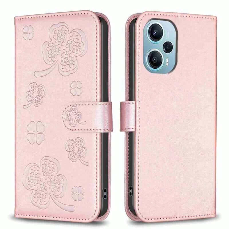 Για Xiaomi Poco F5 5G τετράφυλλο ανάγλυφη δερμάτινη θήκη τηλεφώνου (ροζ)