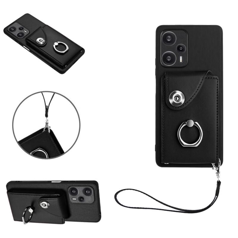 Για Xiaomi Poco F5 5G / Redmi Σημείωση 12 Turbo Οργανική κάρτα τσάντα δαχτυλίδι κάτοχος PU τηλέφωνο υπόθεση με κορδόνι (μαύρο)