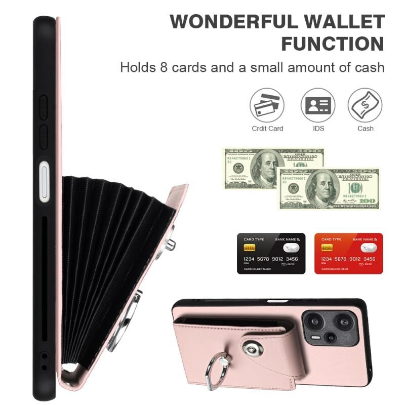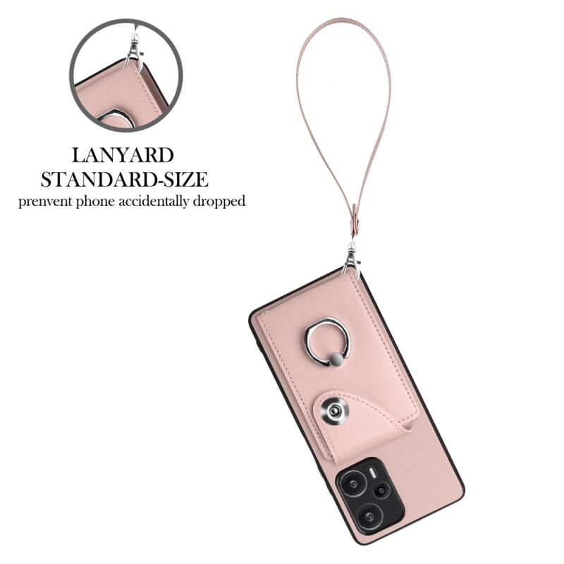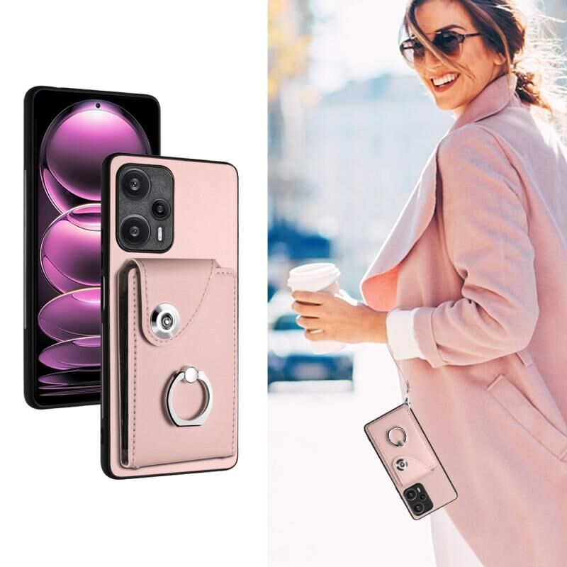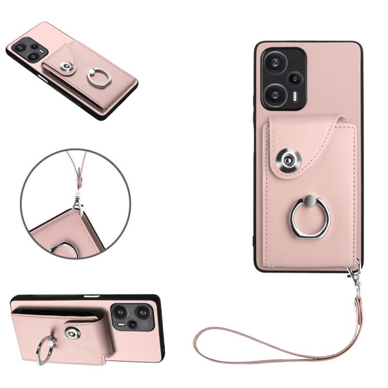 Για Xiaomi Poco F5 5G / Redmi Σημείωση 12 Turbo Οργανική κάρτα τσάντα δαχτυλίδι κάτοχος PU υπόθεση τηλεφώνου με κορδόνι (ροζ)