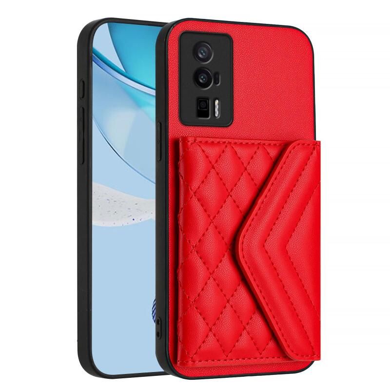 Για Xiaomi Poco F5 Pro 5G Rhombic υφή κάρτα τσάντα RFID υπόθεση τηλεφώνου με μακρύ κορδόνι (Κόκκινο)