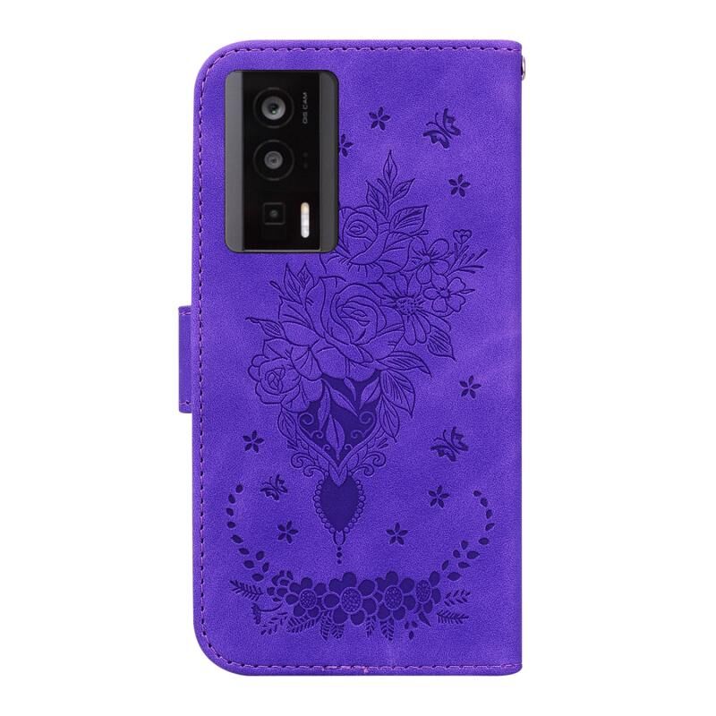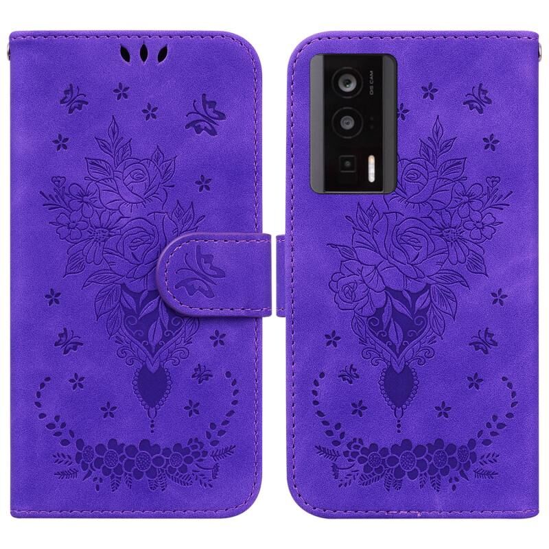 Για Xiaomi Poco F5 Pro / Redmi K60 Πεταλούδα Rose ανάγλυφη δερμάτινη θήκη τηλεφώνου (μωβ)