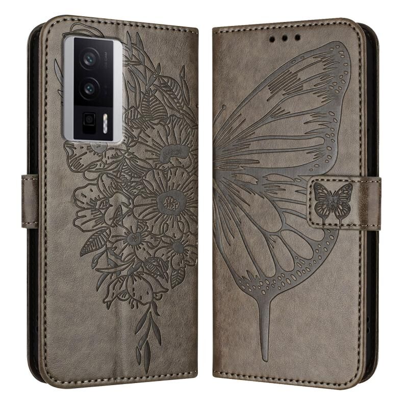 Για Xiaomi Poco F5 Pro / Redmi K60 / K60 Pro ανάγλυφη πεταλούδα δερμάτινη θήκη τηλεφώνου (Γκρι)