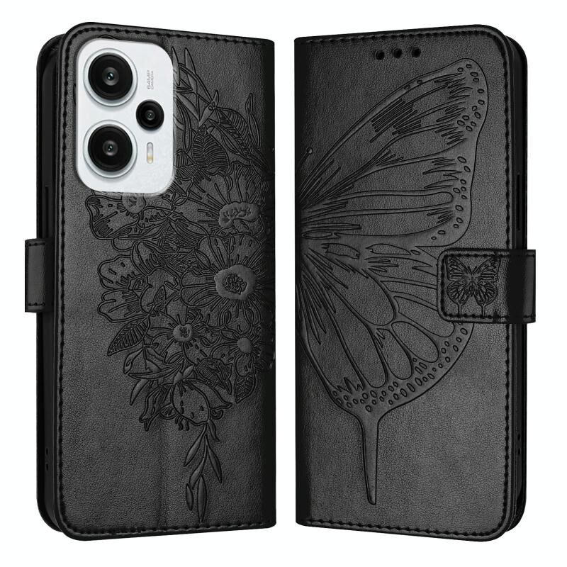 Για Xiaomi Poco F5 / Redmi Note 12 Turbo 5G ανάγλυφη πεταλούδα δερμάτινη θήκη τηλεφώνου (Μαύρο)