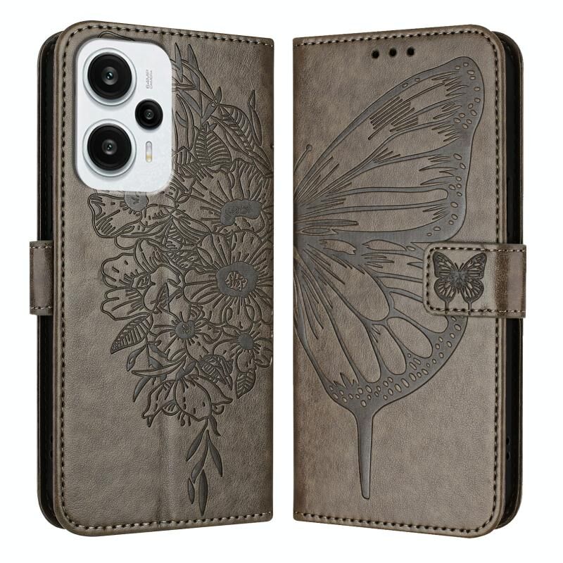 Για Xiaomi Poco F5 / Redmi Note 12 Turbo 5G ανάγλυφη πεταλούδα δερμάτινη θήκη τηλεφώνου (Γκρι)